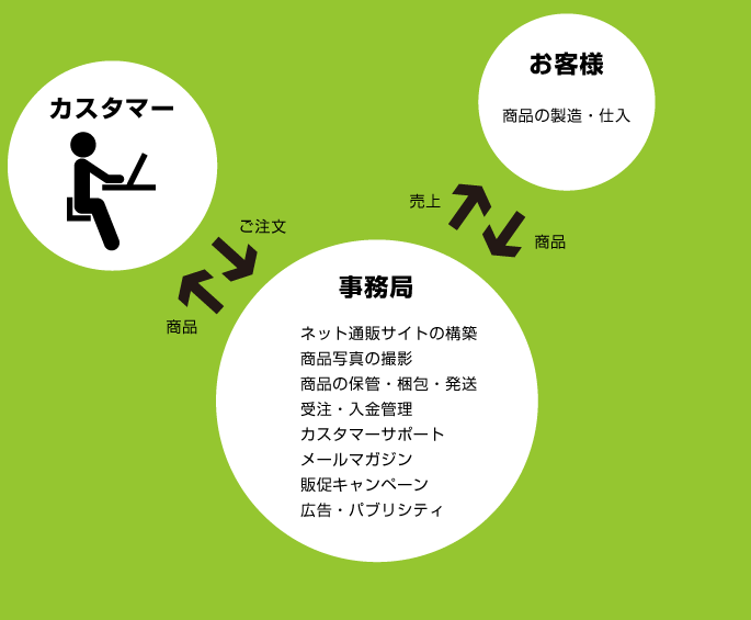 ネット通販事務局代行では、お客様は商品をご用意いただくだけで、その他の販売に関する業務は一括して代行いたします。もちろん一部分業務の代行も可能です。